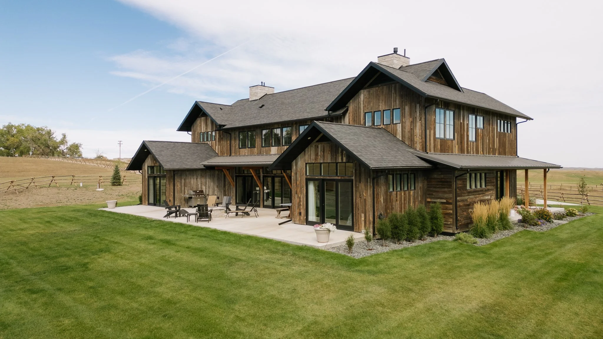 Outside, the home’s reclaimed Wyoming snow fence siding gives the exterior a timeless, weathered character that celebrates its surroundings. A spacious back patio with a gas fireplace sets the stage for evenings under the stars, while custom front concrete pavers provide a refined Western welcome.